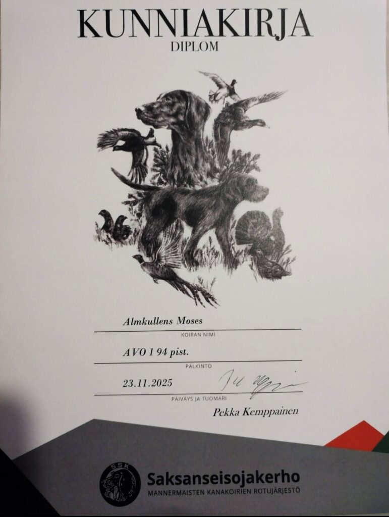 I helgen så startade även Almkullens Moses på jaktprov fast i Finland då, Moses och Kenneth fick ett fint 2 pris i Ökl han fick också denna gång 77 poäng.